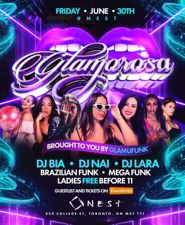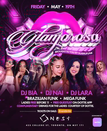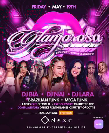 We are thrilled to announce that Dottie App, the best way to find events in Toronto, is sponsoring its first event on May 19th at Nest Toronto. The "Glamorosa 👄" party, organized by GlamUFunk, promises to be a night of electrifying music and entertainment featuring three talented Brazilian female DJs and a full team of Brazilian staff to support the event.